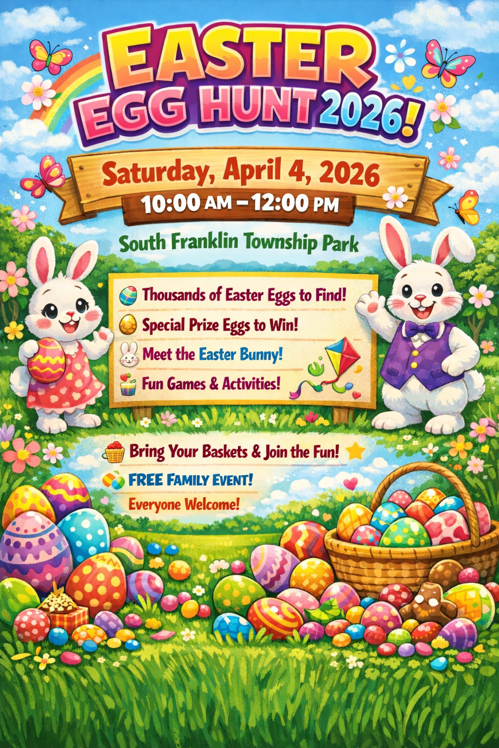 April 4 @ 10:00 am - 12:00 pm Easter Egg Hunt 2026 South Franklin Township Park 100 Municipal Road, Washington